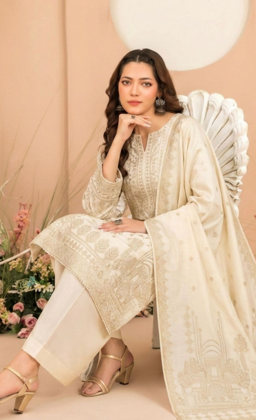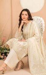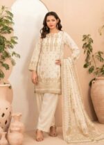 Timeless Sophistication in Off-White Hayaas presents the ultimate classic from the Tawakkal Lania seriesโ€”a stunning Off-White 3-Piece unstitched ensemble. This suit radiates grace and purity, making it a perfect choice for those who appreciate understated luxury. The high-quality Broshia Banarsi Lawn fabric is decorated with intricate gold weaving that catches the light beautifully.