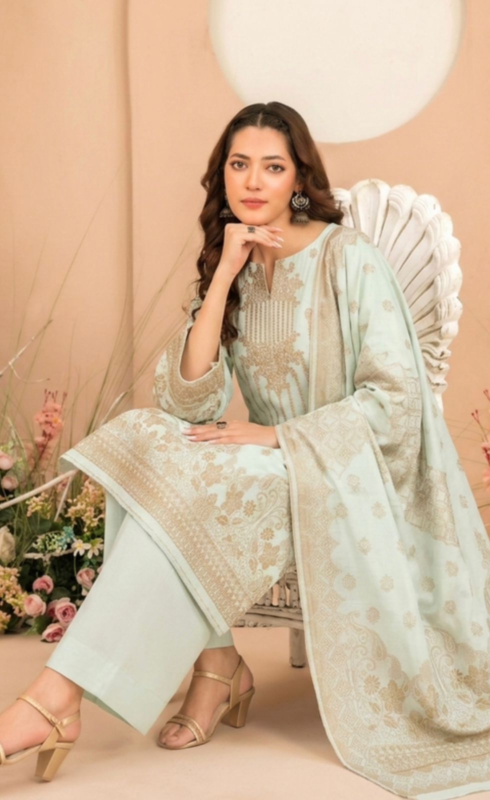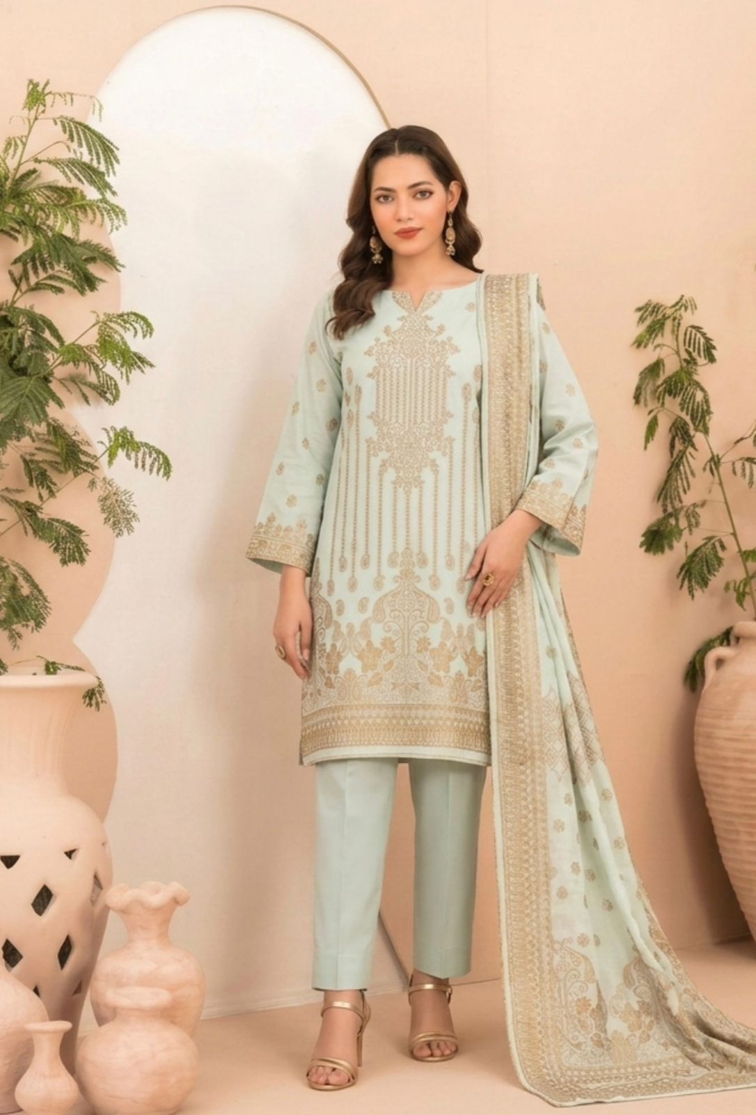 Graceful Sophistication in Mint Green Hayaas introduces a breath of fresh air with this Mint Green 3-Piece unstitched ensemble from the Tawakkal Lania collection. This suit is perfect for women who prefer soft, pastel shades without compromising on the luxury feel of a festive outfit. The base is high-quality Broshia Banarsi Lawn, which offers a slight sheen and a premium texture.