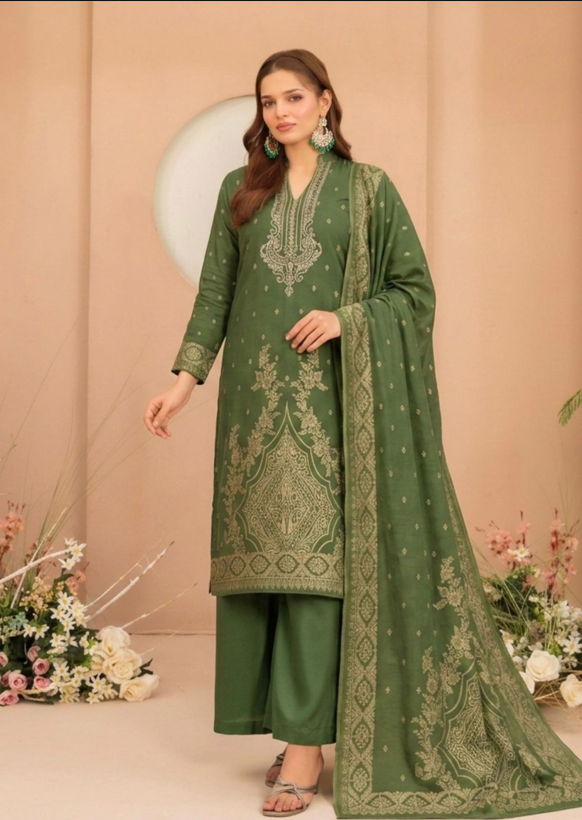 Exquisite Royal Charm in Emerald Green Hayaas presents a masterpiece from the Tawakkal Lania seriesโa Deep Emerald Green 3-Piece unstitched ensemble. This suit is the definition of traditional luxury, featuring a high-quality Broshia Banarsi Lawn fabric that offers both comfort and a regal aesthetic. The rich green hue combined with gold-textured weaving makes it a standout choice for the festive season.