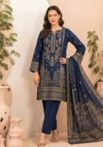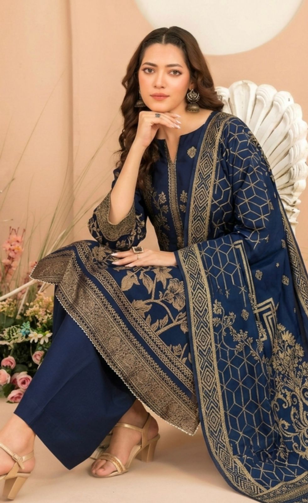 Timeless Grace in Deep Navy Blue Hayaas brings you the epitome of elegance with this Deep Navy Blue 3-Piece suit from the renowned Tawakkal Lania series. Designed for the woman who loves a classic yet bold statement, this outfit features a high-quality Broshia Banarsi Lawn base. The shirt is adorned with a rich blend of geometric patterns and traditional floral motifs in golden thread, giving it a majestic feel.